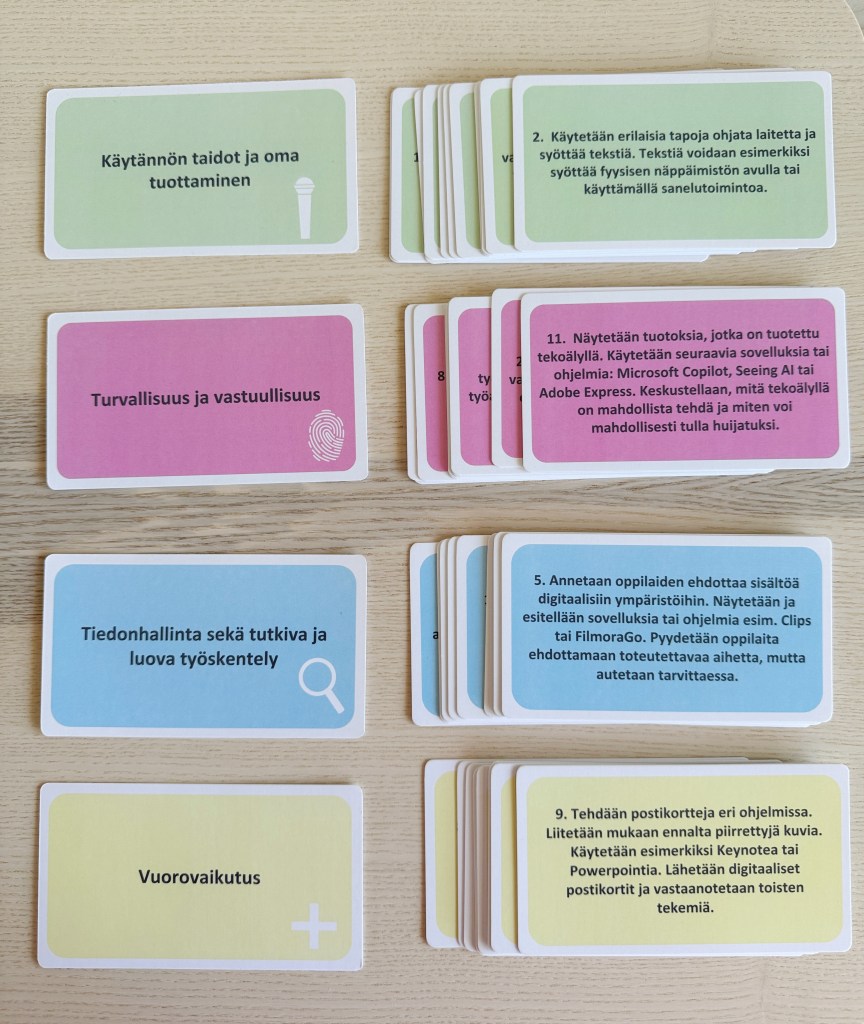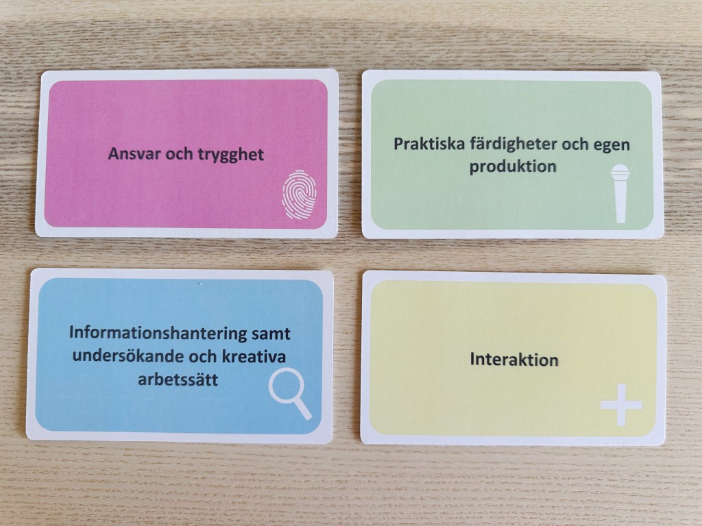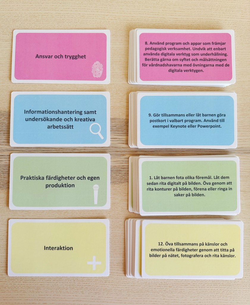 Korten har 4 områden som motsvarar de områden som finns för Nylitteracitet: 1) Grundläggande färdigheter och egen produktion 2) Ansvar och trygghet 3) Informationshantering samt undersökande och kreativa arbetssätt och 4) Interaktion. Varje område har 12 kort. Använd kort från olika kategorier, fördjupa eller förenkla uppgifterna vid behov.