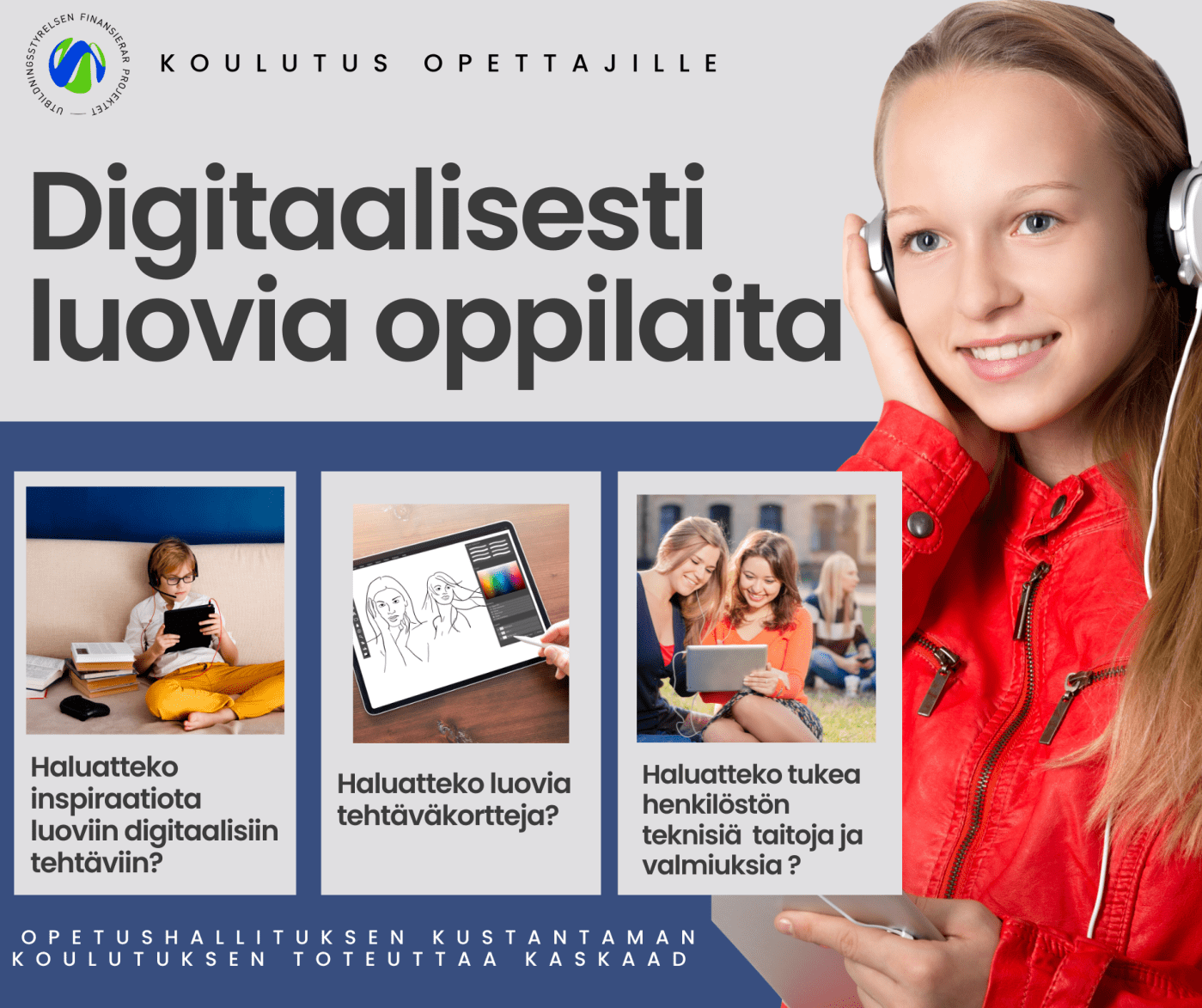 Haluatteko inspiraatiota luoviin digitaalisiin tehtäviin? Haluatteko luovia tehtäväkortteja? Haluatteko tukea ja vahvistaa opettajien teknisiä taitoja?