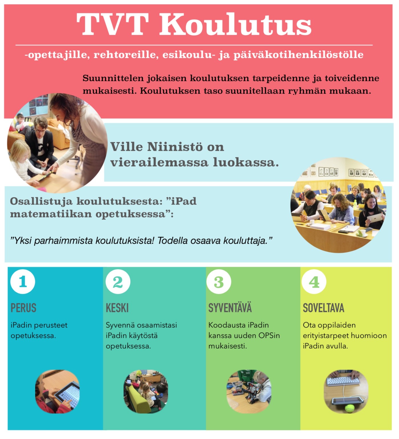 Ota yhteyttä, jos haluatte koulutusta tieto- ja viestintäteknologian hyödyntämisestä opetuksessa tai toiminnassa. Suunnittelen jokaisen koulutuksen tarpeidenne ja toiveidenne mukaisesti, haluamassanne paikassa. Koulutuksen taso suunitellaan ryhmän mukaan. Koulutuksen pituus voidaan sovittaa aikataulunne mukaiseksi, ja koulutus voidaan järjestää myös VESO-koulutuksena.